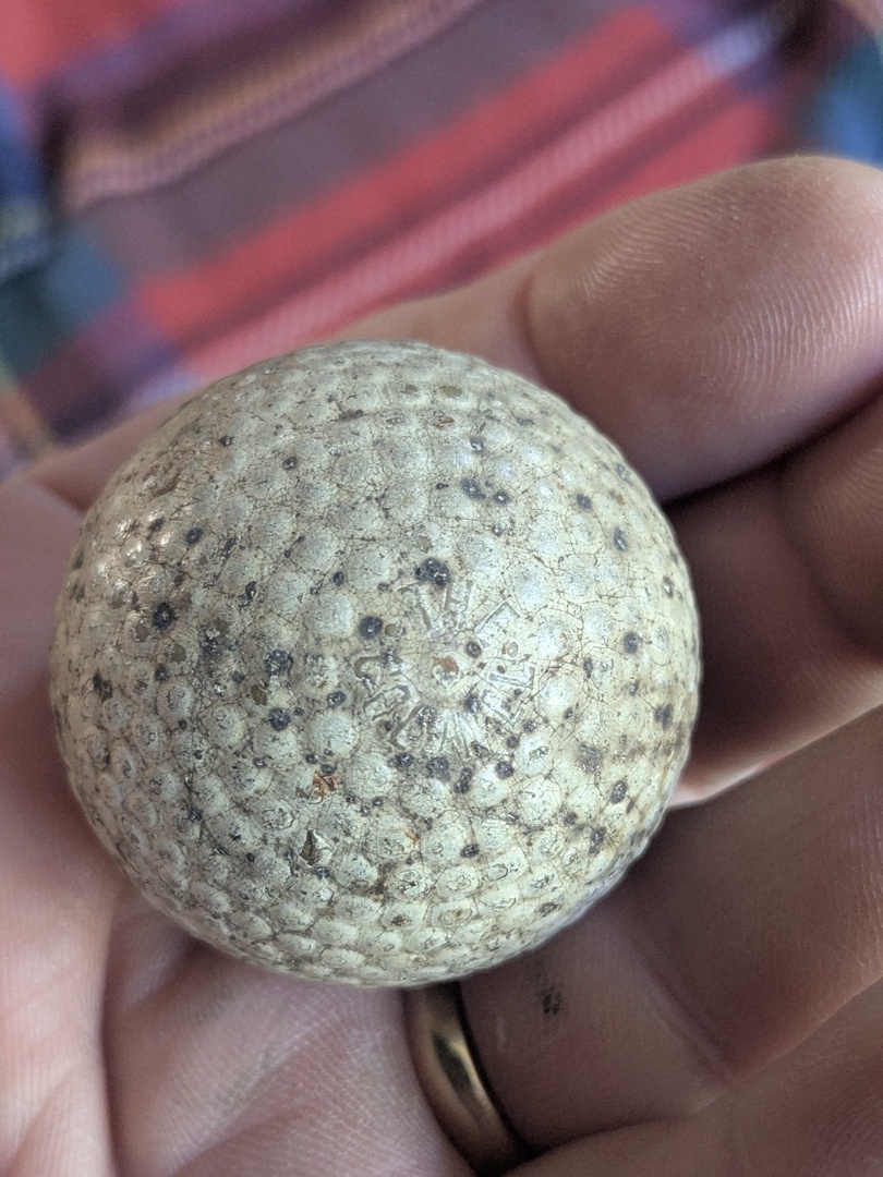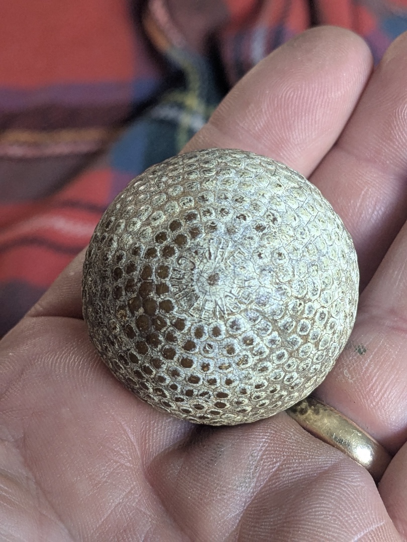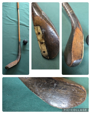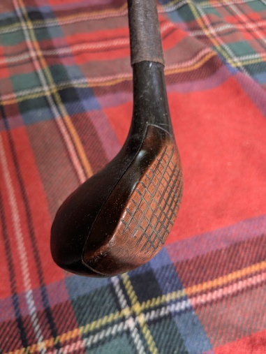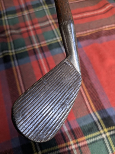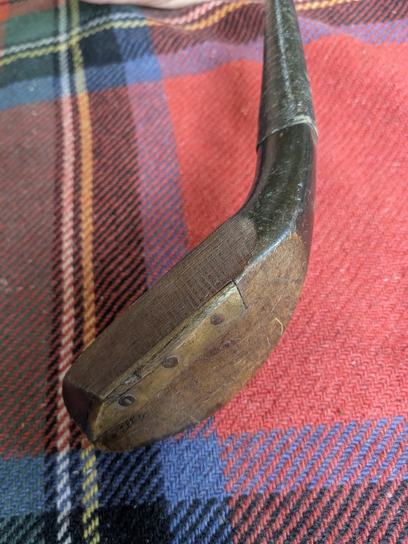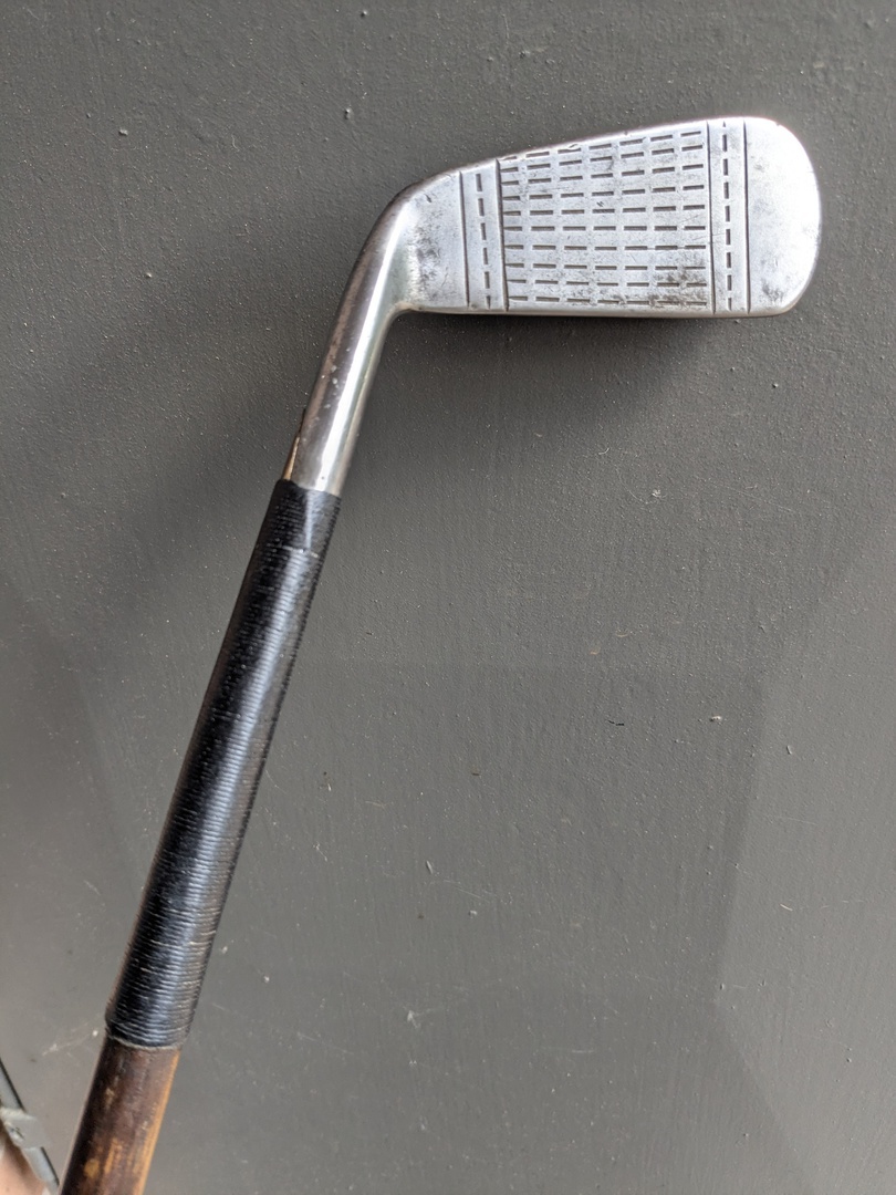 A great example of this scarce type of club. The head started hollow and then is filled with gutta percha. Then the face is riveted on. It also has deep and sharp edged machined grooves. Made by Spalding. They are not rare but finding them in this condition is. Dates about 1910.